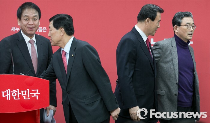 (서울=포커스뉴스) 이한구 새누리당 공천관리위원장과 위원들이 11일 오후 서울 여의도 당사에서 공관위 내부 갈등 등에 대해 사과하는 내용의 기자회견을 마친 뒤 퇴장하고 있다. 왼쪽부터 박종희 위원, 황진하 부위원장, 홍문표 위원, 이 위원장.