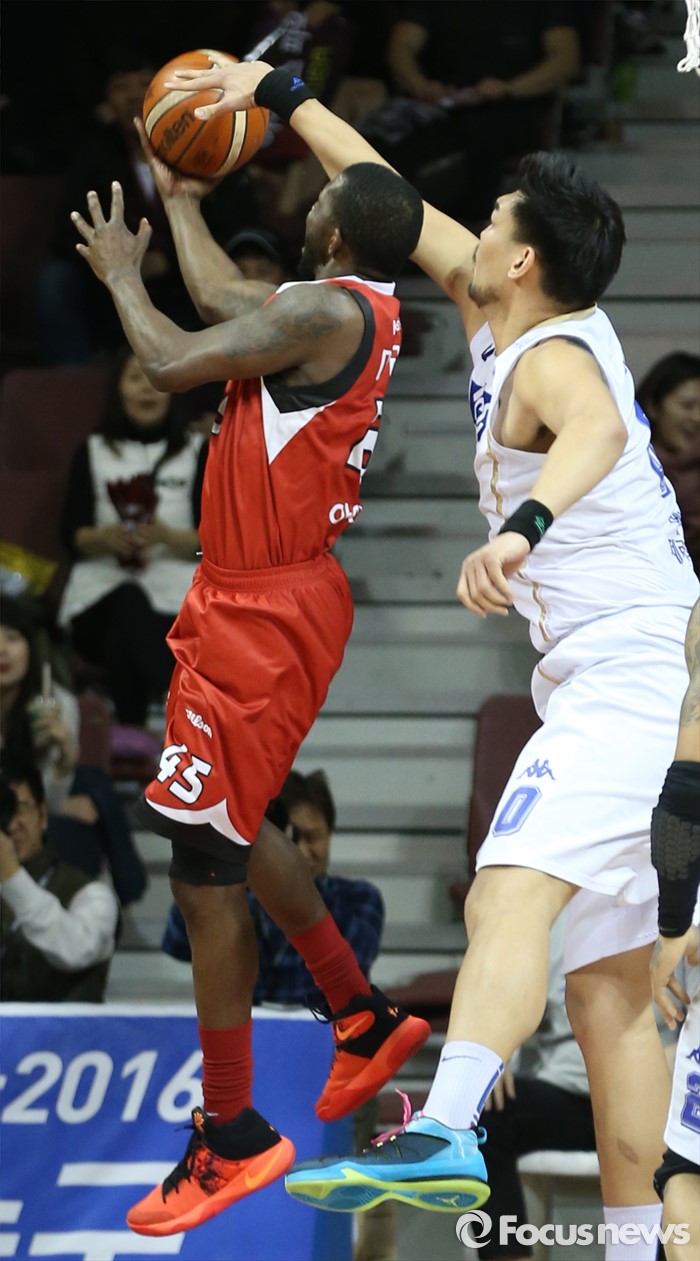 (안양=포커스뉴스) 11일 안양실내체육관에서 열린 2015-2016 프로농구 KGC-KCC 4강플레이오프 3차전에서 KCC 하승진이 KGC 마리오 리틀의 리버스레이업슛을 오른손으로 블로킹하고 있다.
