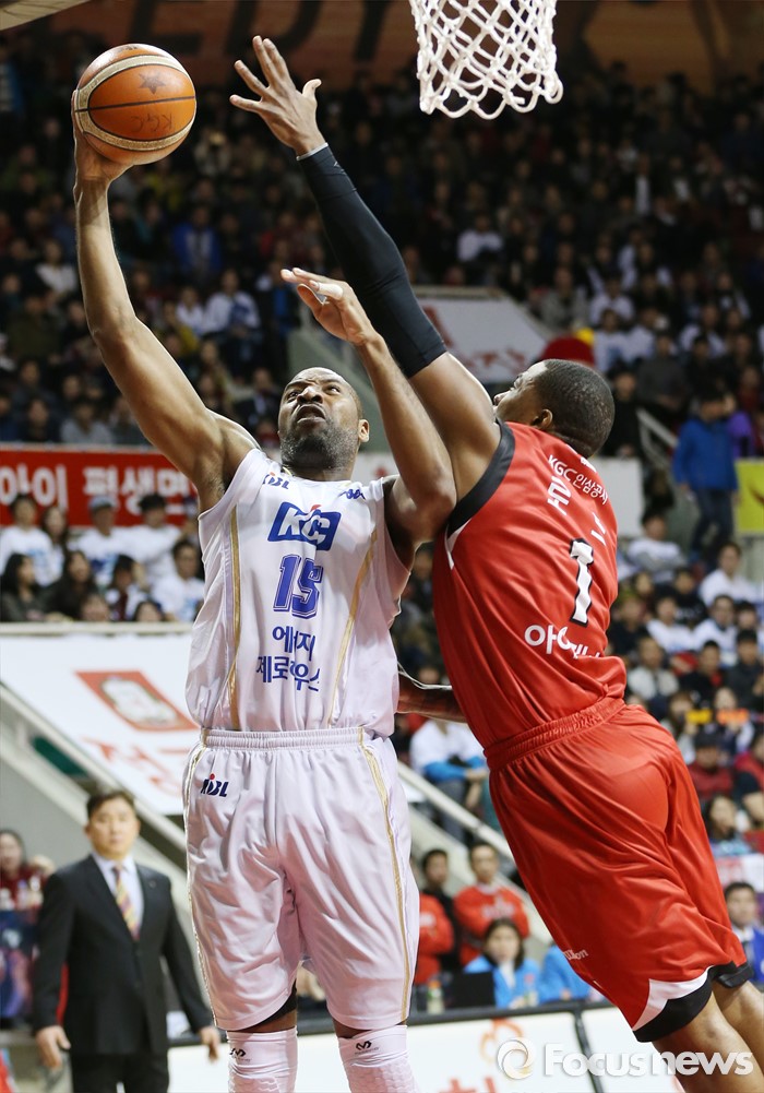 (안양=포커스뉴스) 11일 안양실내체육관에서 열린 2015-2016 프로농구 KGC-KCC 4강플레이오프 3차전에서 KCC 허버트 힐의 슈팅을 KGC 찰스 로드가 블록하려 달려들고 있다.