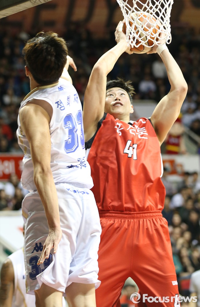 (안양=포커스뉴스) 11일 안양실내체육관에서 열린 2015-2016 프로농구 KGC-KCC 4강플레이오프 3차전에서 KGC 오세근이 KCC 정희재의 마크를 피하며 점프슛을 쏘고 있다.