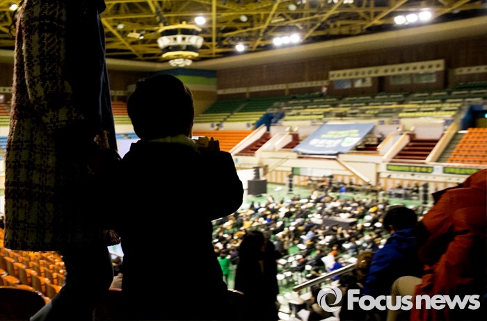 (서울=포커스뉴스) 12일 오후 서울 성동구 한양대학교 올림픽체육관에서 열린 '2017학년도 대학입시설명회'에서 한 어린이가 엄마 손을 잡고 발걸음을 옮기고 있다.