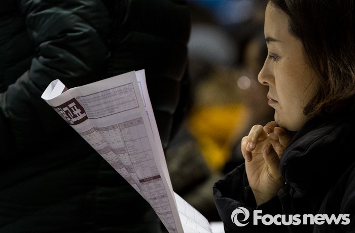 (서울=포커스뉴스) 12일 오후 서울 성동구 한양대학교 올림픽체육관에서 열린 '2017학년도 대학입시설명회'에 참석한 한 학부형이 주요 대학 배치참고표를 보고 있다.