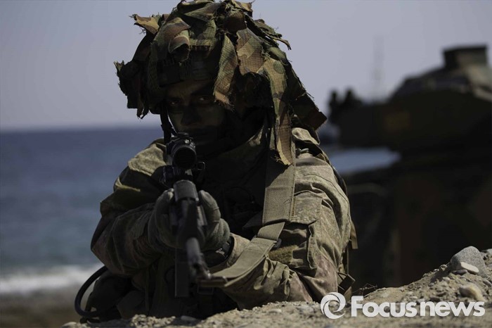 (포항=포커스뉴스) 12일 오후 경북 포항시 일대 해안에서 한미해병대의 연합상륙작전이 실시되었다. 해안가로 돌진하고 있는 상륙돌격장차들에서 일제히 연막을 전개하고 있다.