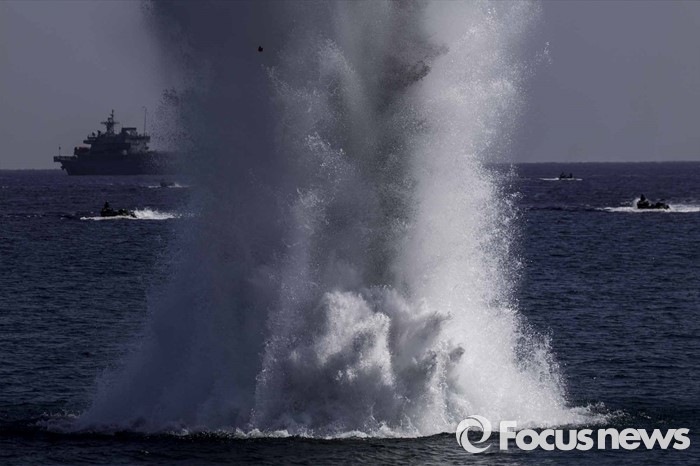 (포항=포커스뉴스) 12일 오후 경북 포항시 일대 해안에서 한미해병대의 연합상륙작전이 실시되었다. 해안가로 돌진하고 있는 상륙돌격장차들에서 일제히 연막을 전개하고 있다.