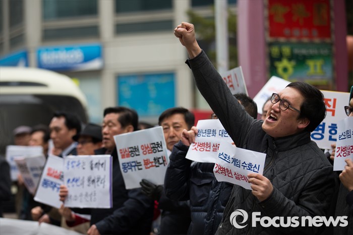 (서울=포커스뉴스) 13일 오전 서울 여의도 더민주 당사 앞에서 전병헌 더불어민주당 의원 지지자들이 정 의원의 컷오프 철회를 요구하는 손팻말을 들고 있다.