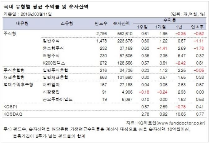 13일 펀드평가사 KG제로인이 지난 11일 공시된 기준 가격으로 펀드 수익률을 조사한 결과, 전체 국내 주식형펀드는 한 주간 0.61% 상승했다.