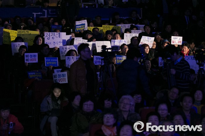 (서울=포커스뉴스) 정청래 더불어민주당 의원 지지자들이 13일 오후 서울 여의도 국회 의원회관에서 열린 더불어경제콘서트에 참석해, 정 의원 공천 탈락에 대해 항의하는 손팻말을 들고 있다.