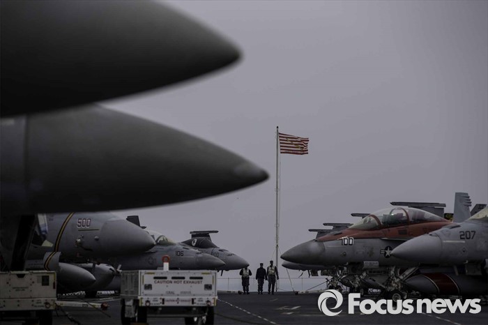 (부산=포커스뉴스) 13일 오후 부산 남구에 위치한 해군작전사령부에 입항한 존 C. 스테니스 핵항모가 취재진에게 공개되었다. 키리졸브 독수리 훈련에 참가하기 위해 한국을 찾은 스테니스항모는 길이 333m, 폭 78m,탑승 승조원은 6500명에 달하는 미 해군 핵심항모 중 하나다. 주기되어 있는 전투기들 사이로 함대기가 보인다.