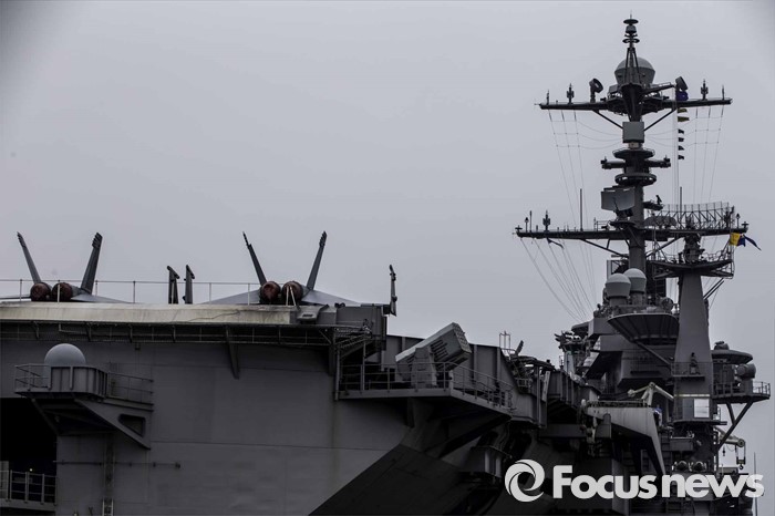 (부산=포커스뉴스) 13일 오후 부산 남구에 위치한 해군작전사령부에 입항한 존 C. 스테니스 핵항모가 취재진에게 공개되었다. 키리졸브 독수리 훈련에 참가하기 위해 한국을 찾은 스테니스항모는 길이 333m, 폭 78m,탑승 승조원은 6500명에 달하는 미 해군 핵심항모 중 하나다. 스네티스 항모의 후미모습.