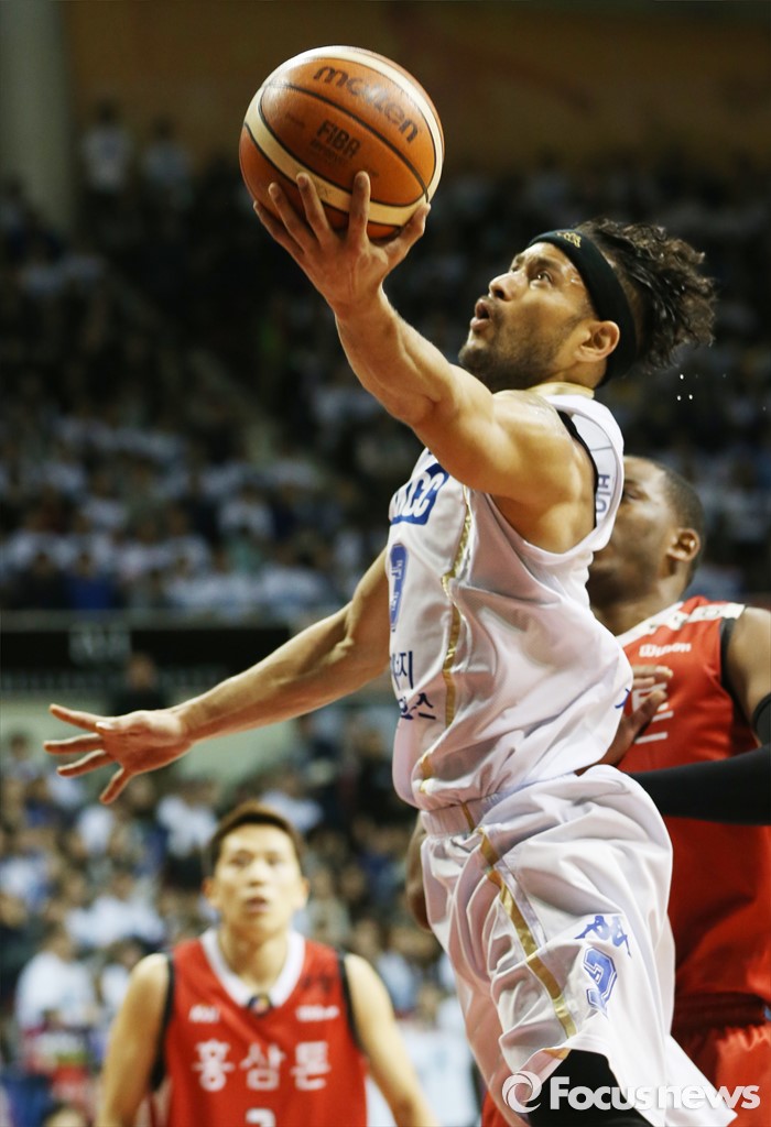 (안양=포커스뉴스) 13일 안양실내체육관에서 열린 2015-2016 프로농구 KGC-KCC 4강플레이오프 4차전에서 KCC 전태풍이 KGC 찰스 로드의 수비를 꿇고 레이업슛을 쏘고 있다.