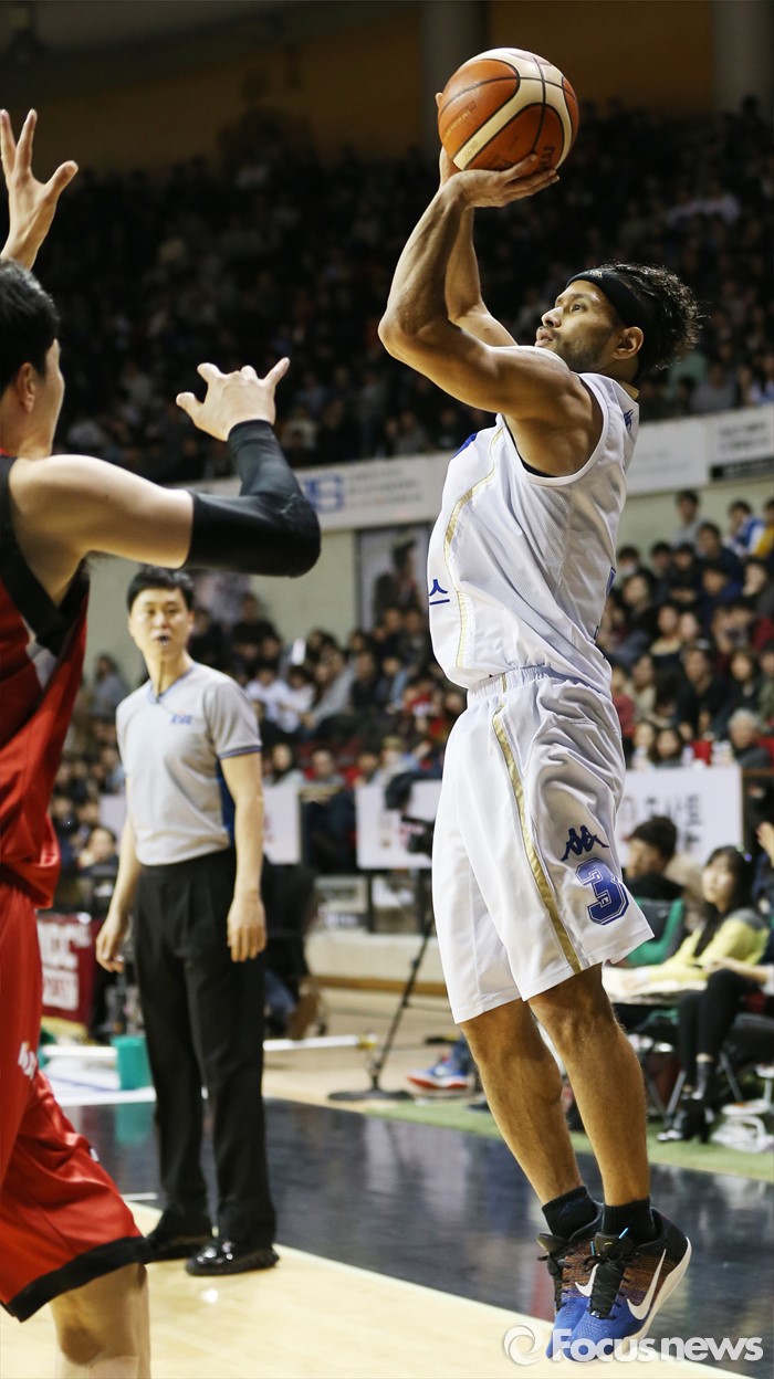 (안양=포커스뉴스) 13일 안양실내체육관에서 열린 2015-2016 프로농구 KGC-KCC 4강플레이오프 4차전에서 KCC 전태풍이 KGC 김민욱을 앞에 두고 3점슛을 쏘고 있다.