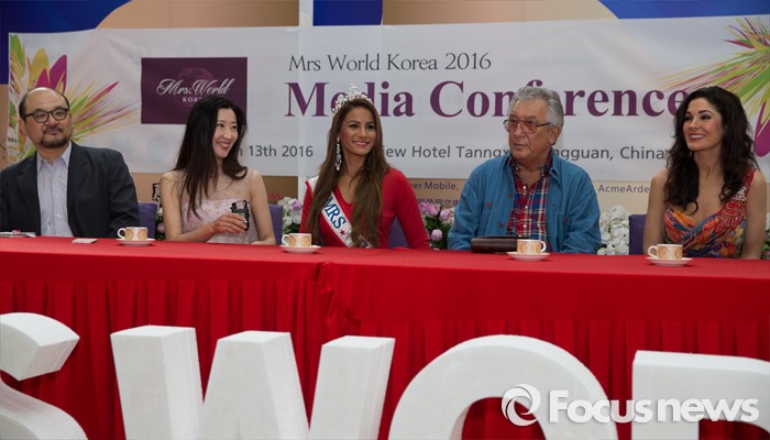 (동관/중국=포커스뉴스) 13일 오전 중국 광동성 동관 굿뷰호텔에서 열린 제28회 미시즈월드 한국 개최 기자간담회에 관계자들이 취재진의 질문에 답하고 있다. 왼쪽 두번째부터 송지연 미시즈월드 한국조직위원회 위원장, Mrs. World 2016 우승자 캔디스 드보라 아브람스, 데이빗 마르멜 미시즈월드 회장.
