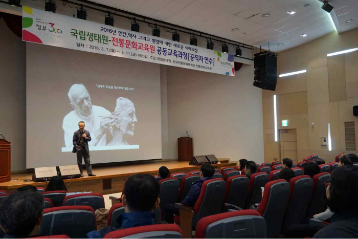 교육에 참여한 공무원들은 "문화유산과 자연생태학에 인문학을 접목한 새로운 프로그램을 통해 안목과 시야를 넓힐 수 있는 유익한 시간이었다"고 밝혔다.국립생태원-전통문화교육원 공동교육과정 교육진행 모습.<사진제공=문화재청>