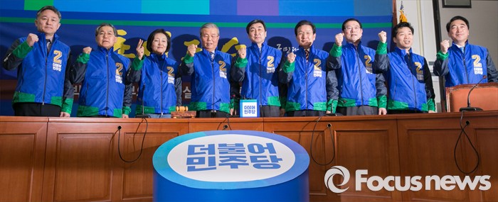 (서울=포커스뉴스) 20대 총선 D-30일인 14일 오전 서울 여의도 국회에서 김종인 더불어민주당 비대위 대표 등 비대위원들이 비상대책위원회의에 앞서 총선 필승 퍼포먼스를 하고 있다. 왼쪽부터 표창원, 우윤근, 박영선 비대위원, 김 대표, 이종걸 원내대표, 변재일, 이용섭, 김병관 비대위원, 박수현 대표비서실장.