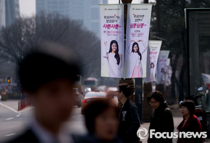 (서울=포커스뉴스) 20대 총선을 30일 앞둔 14일 오전 서울 여의도 국회 인근 가로등에 '아름다운 선거 홍보대사'인 그룹 AOA의 설현을 모델로 제작된 서울시선거관리위원회 현수기가 게시되어 있다.