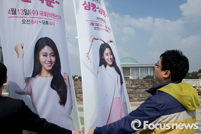 (서울=포커스뉴스) 20대 총선을 30일 앞둔 14일 오전 서울 여의도 국회 앞에서 서울시선거관리위원회 직원들이 '아름다운 선거 홍보대사'인 그룹 AOA의 설현을 모델로 제작된 가로등 현수기를 게시하고 있다.