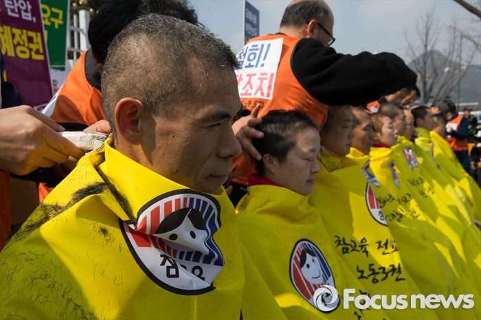 (서울=포커스뉴스) 14일 오후 서울 종로구 정부서울청사앞에서 전국교직원노동조합원 및 관계자들이 법외노조 판결에 대한 교육당국의 후속조치 철회를 촉구하며 삭발을 하고 있다.