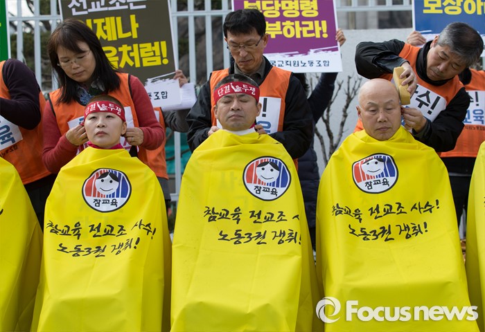 (서울=포커스뉴스) 14일 오후 서울 종로구 정부서울청사 앞에서 변성호(가운데) 전국교직원노동조합 위원장을 비롯한 전임자들이 정부의 법외노조 후속조치와 부당탄압에 항의하며 삭발식을 하고 있다.
