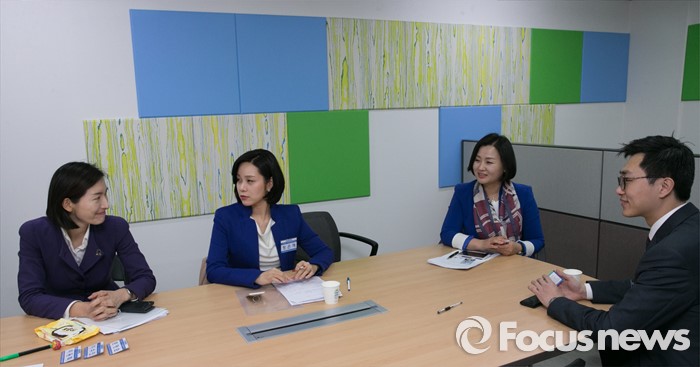 (서울=포커스뉴스) 20대 총선을 30일 앞둔 14일 오후 서울 여의도 더불어민주당사에서 열린 청년 및 노동분야 비례대표 후보 면접에 참석한 김빈(왼쪽부터), 정은혜, 이수진, 장경태 후보가 면접을 기다리며 대화하고 있다.