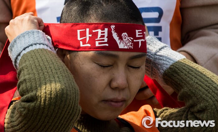 (서울=포커스뉴스) 14일 오후 서울 종로구 정부서울청사 앞에서 전국교직원노동조합 전임자들이 정부의 법외노조 후속조치와 부당탄압에 항의하며 삭발식을 하고 있다.