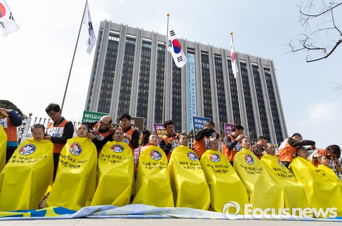 (서울=포커스뉴스) 14일 오후 서울 종로구 정부서울청사 앞에서 전국교직원노동조합 전임자들이 정부의 법외노조 후속조치와 부당탄압에 항의하며 삭발식을 하고 있다.
