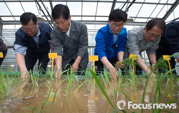 (청주=포커스뉴스) 14일 오후 충북 청주시 청원구 오창읍 충북농업기술원에서 열린 기능성 유색미 신품종 육성을 위한 첫 모내기 행사에서 박제국 충북행정부지사와 직원들이 모내기를 하고 있다.