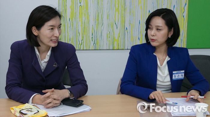 (서울=포커스뉴스) 20대 총선을 30일 앞둔 14일 오후 서울 여의도 더불어민주당사에서 열린 청년 및 노동분야 비례대표 후보 면접에 참석한 김빈(왼쪽), 정은혜 후보가 면접을 기다리며 대화하고 있다.