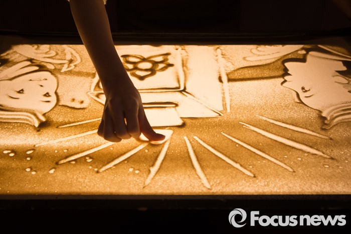 (서울=포커스뉴스) 14일 오후 서울 종로구 대한민국역사박물관에서 열린 대한민국 선거의 역사 '선거, 민주주의를 키우다.' 특별전시회 개막식에서 샌드 아티스트가 투표함을 그리고 있다.