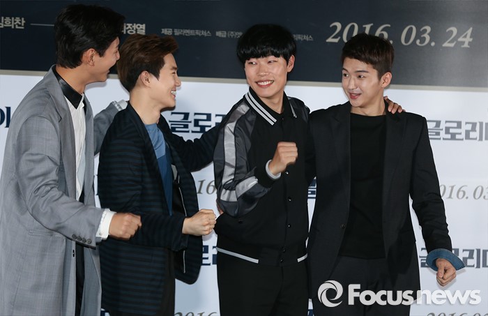 (서울=포커스뉴스) 14일 오후 서울 성동구 왕십리 CGV에서 열린 영화 '글로리데이' 언론시사회에 참석한 배우 지수(왼쪽부터), 김준면, 류준열, 김희찬이 포토타임을 갖던 중 환하게 웃고 있다.