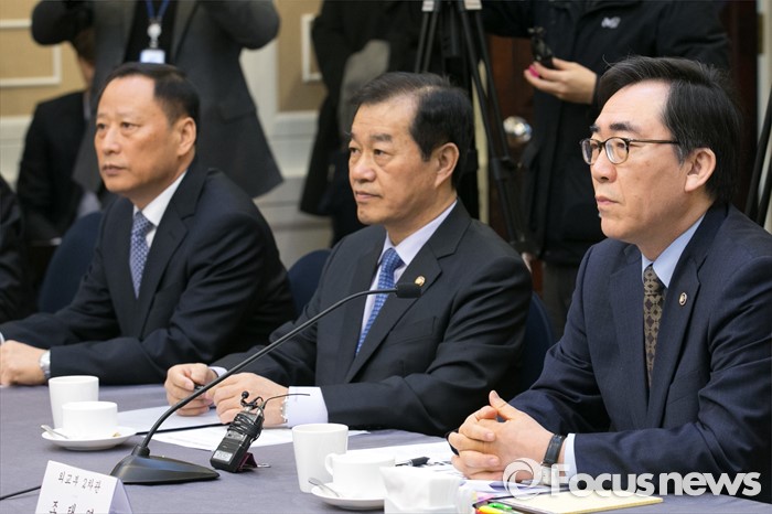 (서울=포커스뉴스) 조태열(오른쪽부터) 외교부 2차관과 황인무 국방부 차관, 최종일 국정원 3차장이 15일 오전 서울 여의도 국회 귀빈식당에서 열린 안보상황 점검 긴급 당정협의에 참석해, 자리에 앉아 있다.