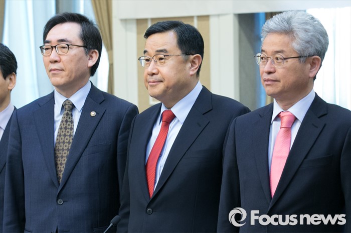 (서울=포커스뉴스) 조태열(왼쪽부터) 외교부 2차관과 김정훈 새누리당 정책위의장, 이철우 정보 정조위원장이 15일 오전 서울 여의도 국회 귀빈식당에서 열린 안보상황 점검 긴급 당정협의에 참석해 기념사진을 찍고 있다.