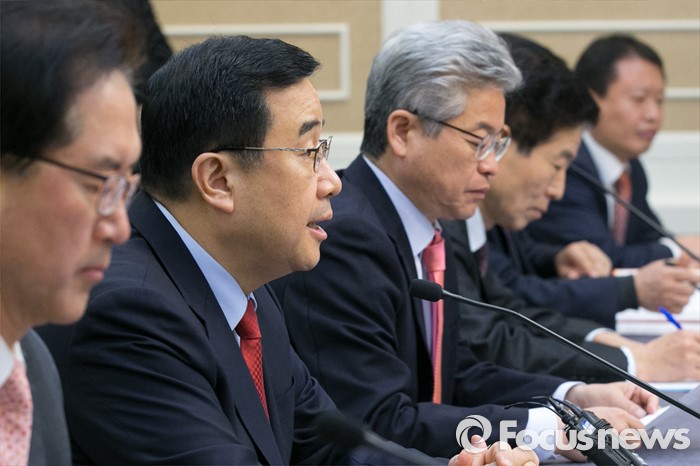 (서울=포커스뉴스) 김정훈(왼쪽 두번째) 새누리당 정책위의장이 15일 오전 서울 여의도 국회 귀빈식당에서 열린 안보상황 점검 긴급 당정협의에 참석해, 모두발언하고 있다.
