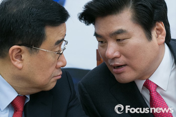 (서울=포커스뉴스) 원유철(오른쪽) 새누리당 원내대표와 김정훈 정책위의장이 15일 오전 서울 여의도 국회에서 열린 원내대책회의에 참석해, 대화하고 있다.