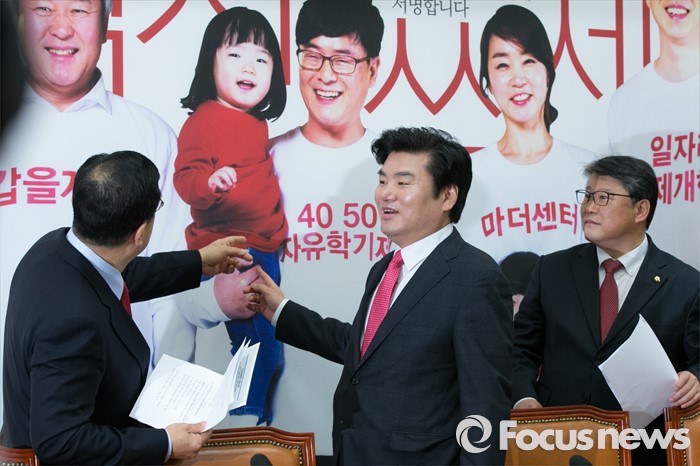 (서울=포커스뉴스) 원유철(가운데) 새누리당 원내대표와 김정훈(왼쪽) 정책위의장, 조원진 원내수석부대표가 15일 오전 서울 여의도 국회에서 열린 원내대책회의에 참석해, 회의장 배경판을 보며 대화하고 있다.