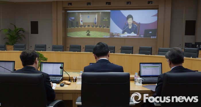 (세종=포커스뉴스) 15일 오전 세종시 정부세종청사 국무회의장에서 열린 청와대-세종청사 국무회의에서 국무위원들이 영상을 통해 박근혜 대통령의 모두발언을 경청하고 있다.