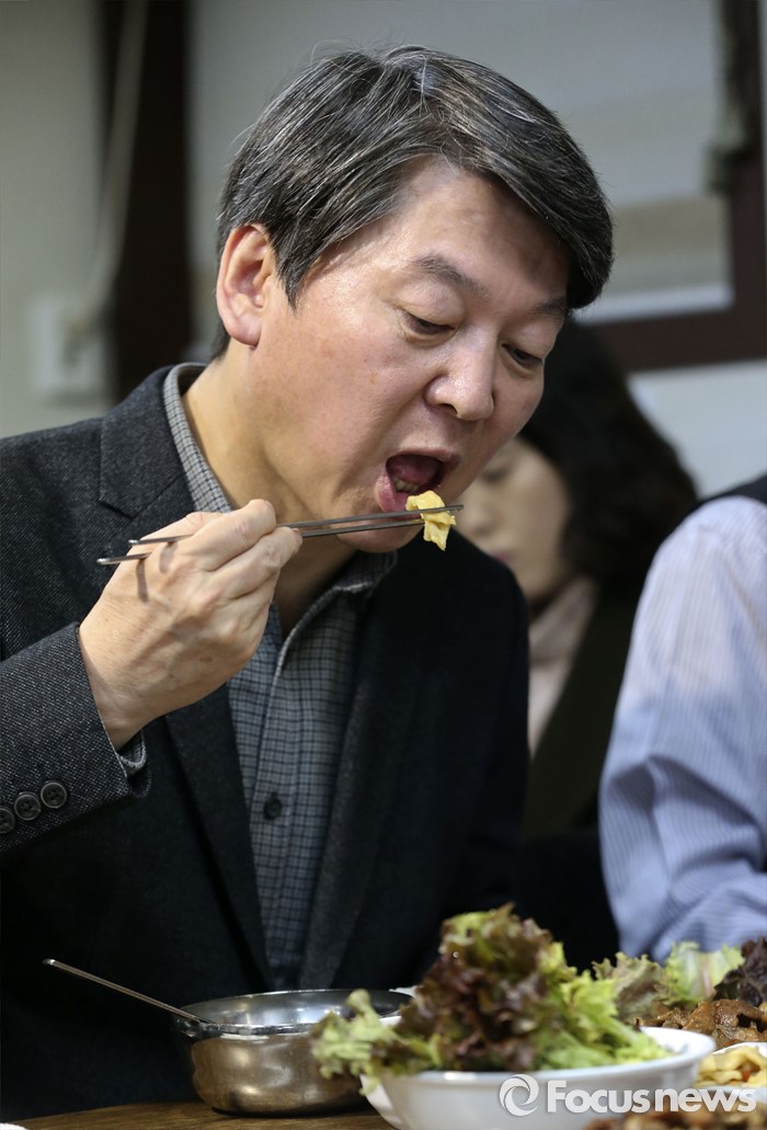 (서울=포커스뉴스) 안철수 국민의당 상임공동대표가 15일 오후 서울 마포구 연남동 한 식당에서 택시기사들과 식사를 하고 있다.