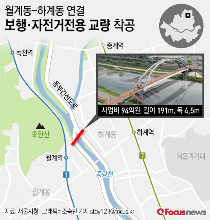 (서울=포커스뉴스) 15일 서울시는 이달말 사업비 94억원을 투입해 노원구 소재 초안산 앞 중랑천을 가로질러 하계동과 월계동을 연결하는 보행·자전거 전용 교량을 착공 예정이라고 밝혔다.
