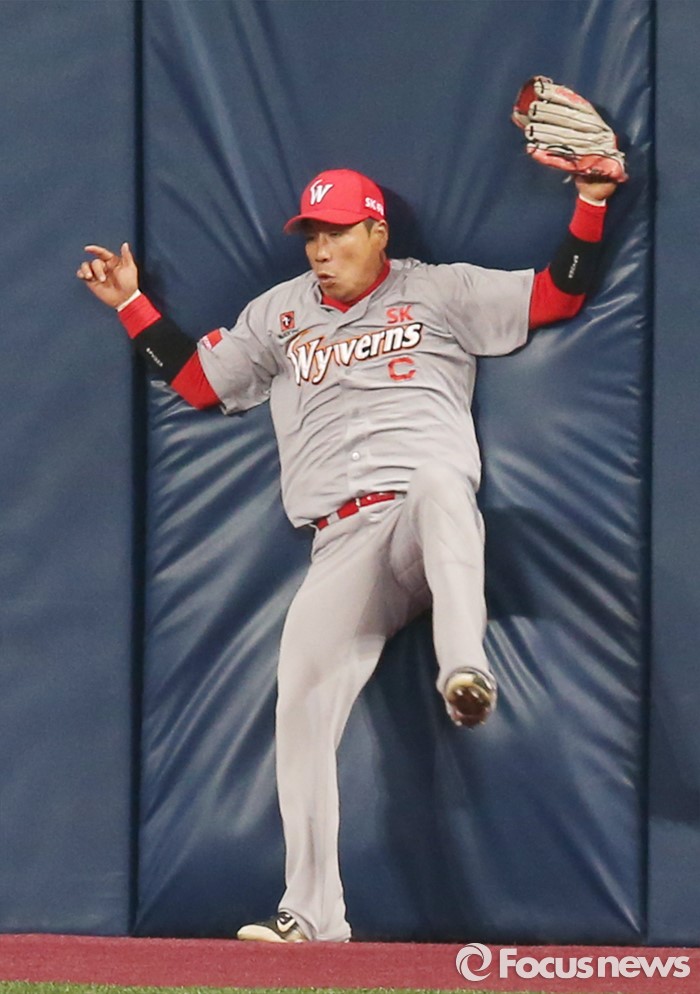 (서울=포커스뉴스) 15일 서울 고척스카이돔에서 열린 2016 프로야구 시범경기 SK-넥센 경기에서 2회말 1사 1루에서 넥센 임병욱의 좌중간에 뜬공을 SK 좌익수 이명기가 달려가 잡으면서 펜스에 부딪치고 있다.