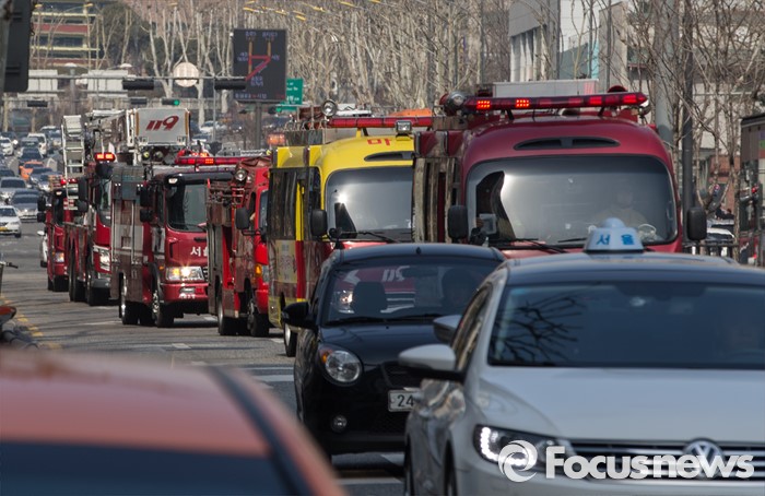 (서울=포커스뉴스) 올해 첫 민방위 훈련이 실시된 15일 오후 서울 마포대로 일대에서 마포소방서 소속 소방차가 길터주기 국민참여 훈련을 하고 있다.