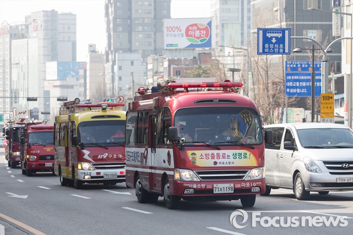 (서울=포커스뉴스) 올해 첫 민방위 훈련이 실시된 15일 오후 서울 마포대로 일대에서 마포소방서 소속 소방차가 길터주기 국민참여 훈련을 하고 있다.