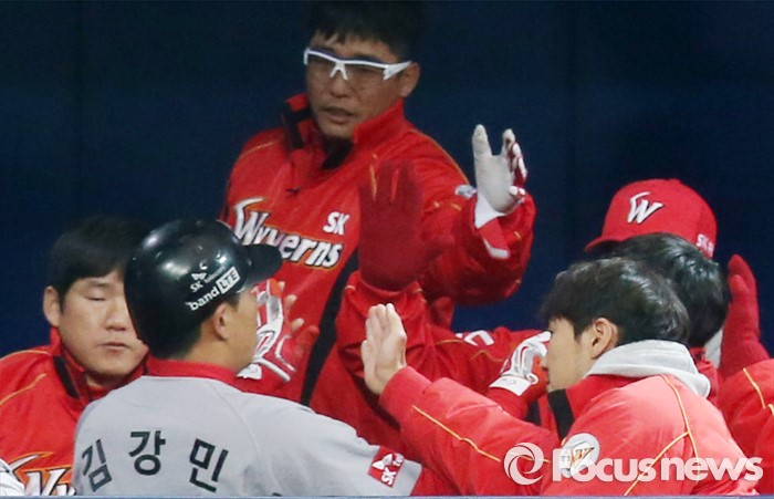 (서울=포커스뉴스) 15일 서울 고척스카이돔에서 열린 2016 프로야구 시범경기 SK-넥센 경기 4회초 2사 만루에서 SK 김강민이 우월 만루홈런을 치고 덕아웃에서 동료들의 환영을 받고 있다.