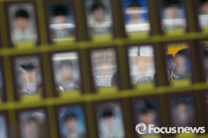 (서울=포커스뉴스) 15일 오후 서울 광화문광장에서 세월호 참사 희생자들의 사진에 세월호 700일 기획전시 개관식 및 2주기 추모의 달 공표 기자회견 모습이 반영되고 있다.