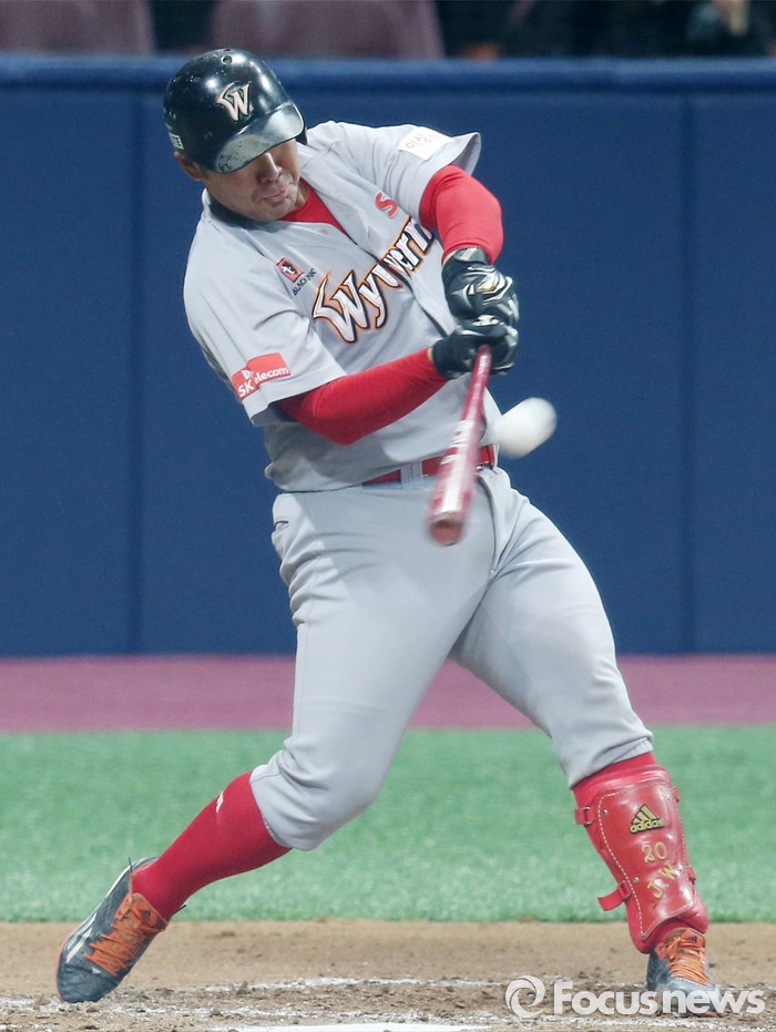 (서울=포커스뉴스) 15일 서울 고척스카이돔에서 열린 2016 프로야구 시범경기 SK-넥센 경기 7회 SK 이재원이 좌중간 3루타를 날리고 있다.