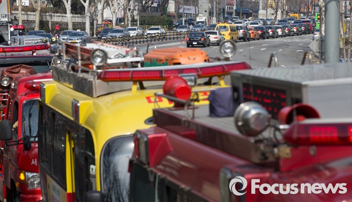 (서울=포커스뉴스) 올해 첫 민방위 훈련이 실시된 15일 오후 서울 마포대로 일대에서 마포소방서 소속 소방차가 길터주기 국민참여 훈련을 하고 있다.