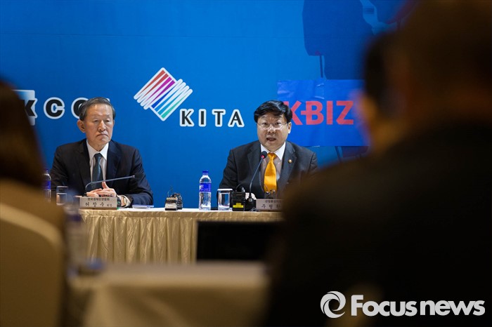 (서울=포커스뉴스) 주형환(오른쪽) 산업통상자원부 장관이 15일 오후 서울 영등포구 전국경제인연합회관에서 열린 '해외진출 성과확산 토론회'에 참석해 모두발언을 하고 있다.