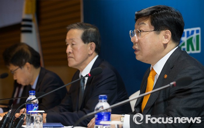(서울=포커스뉴스) 주형환(오른쪽) 산업통상자원부 장관이 15일 오후 서울 영등포구 전국경제인연합회관에서 열린 '해외진출 성과확산 토론회'에 참석해 모두발언을 하고 있다.
