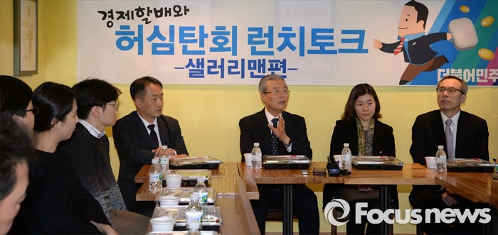 김 대표는 이날 여의도의 한 카페에서 열린 '경제할배와 허심탄회 런치토크-샐러리맨편' 행사에서 직장인 10여명과 만나 "3년 전 내가 새누리당 박근혜 대통령의 당선을 위해 굉장히 애쓴 사람인데, 경제민주화를 하겠다고 철저하게 약속했기 때문이다. 그런데 선거가 끝나니 그 말 자체가 없어져 버렸다"면서 이같이 말했다.