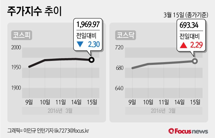 (서울=포커스뉴스) 15일 코스피지수는 전날 보다 0.12%(2.30포인트) 내린 1969.97에 장을 마쳤다. 코스닥지수는 전일 대비 0.33%(2.29포인트) 오른 693.34에 마감했다.