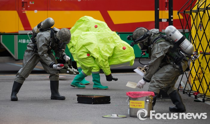 (서울=포커스뉴스) 15일 오후 서울 서초구 고속터미널 광장에서 훈련 참가자들이 시민안전확보를 위한 유관기관 합동 대테러 종합훈련을 하고 있다.