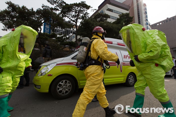 (서울=포커스뉴스) 15일 오후 서울 서초구 고속터미널 광장에서 훈련 참가자들이 시민안전확보를 위한 유관기관 합동 대테러 종합훈련을 하고 있다.